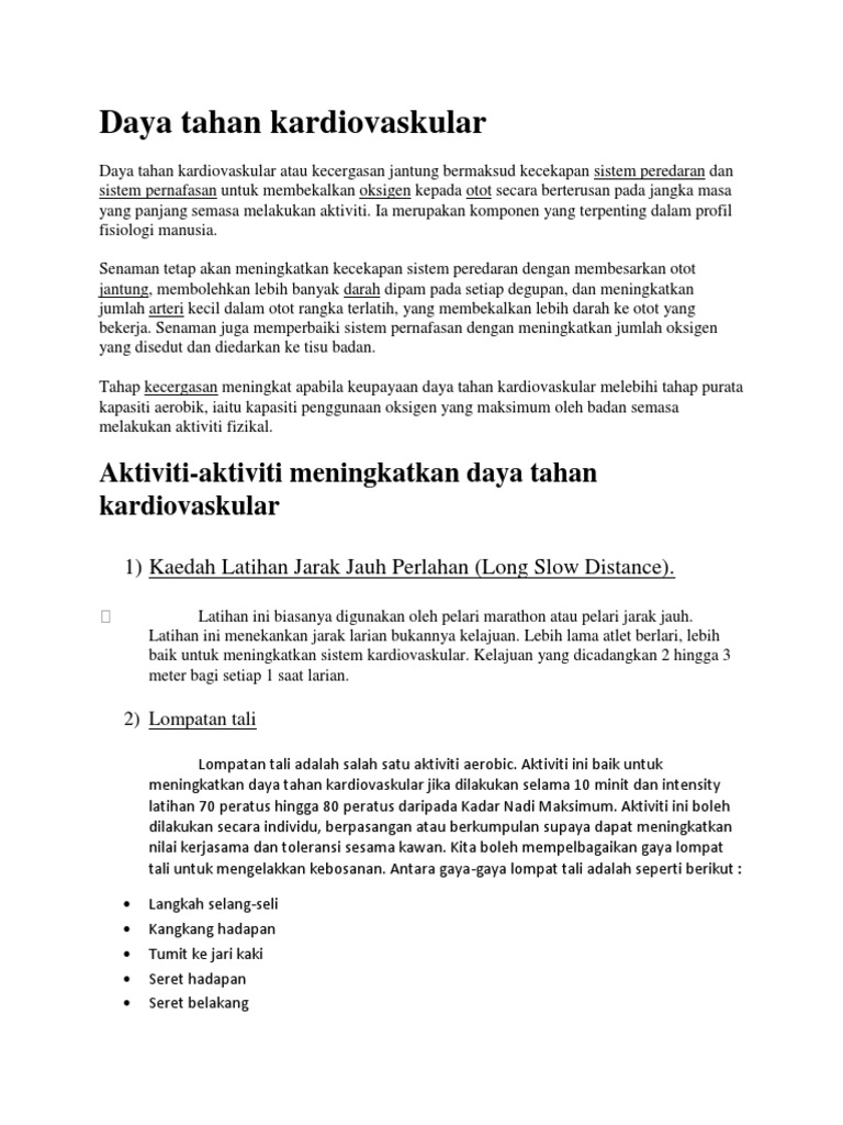 You have just read the article entitled Maksud Daya Tahan Kardiovaskular. Daya Tahan Kardiovaskular. Ianya adalah berkaitan dengan kebolehan otot untuk mengulangi pergerakan submaximal rintangan atau tekanan untuk mengekalkan darjah.