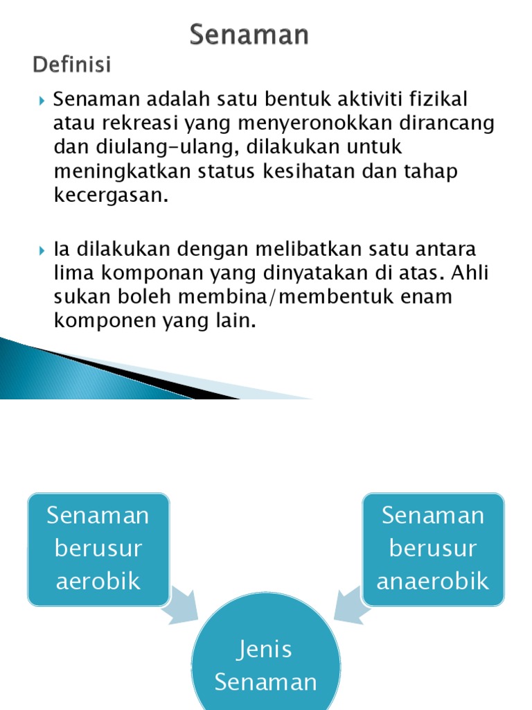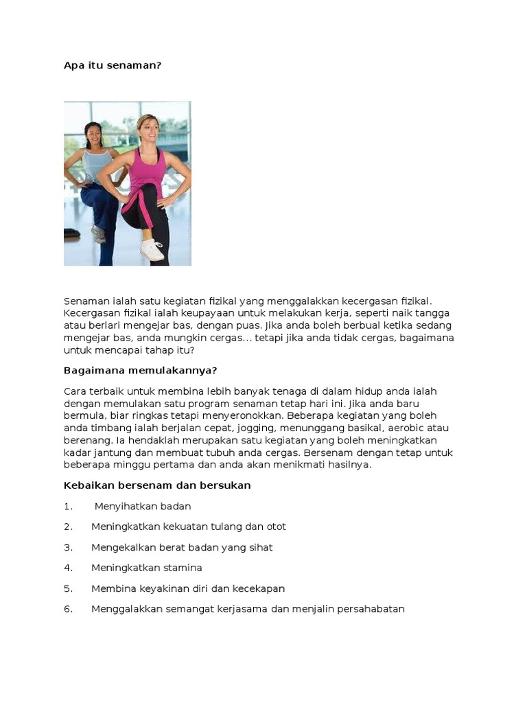 Berlari menunggang basikal senaman aerobik dan sebagainya Phase 2 Apakah maksud Kesihatan. Tujuannya adalah untuk mendapatkan manfaat kesihatan baik dari segi fizikal dan juga mental. Senaman ialah pergerakan badan yang dilakukan secara berulang-kali secara terancang dan berstruktur bertujuan untuk meningkatkan atau mengekalkan satu atau lebih komponen kecergasan fizikal.