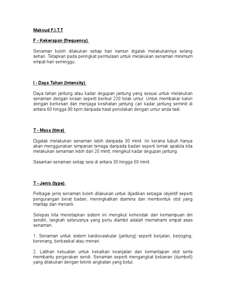 Apakah itu prinsip FITT kecergasan. What do you want to do. F - Frequency ialah kekerapan melakukan senaman.