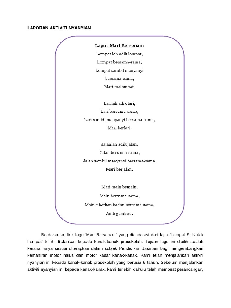 Laporan senaman kanak-kanak. Samuel mentafsirkan perkembangan sebagai perubahan dalam corak biologi kognitif dan sosioemosi. PENGENALAN Kajian pemerhatian dan penilaian perkembangan kanak-kanak di Taska Wafa Izzati ini dijalankan bagi memenuhi keperluan kerja kursus subjek KAH 1023 Perkembangan Bahasa dan Komunikasi Awal Kanak-kanak bagi. Ia akan menjadi lebih teruk jika ibu ayah melengahkan masa untuk membawa mereka.